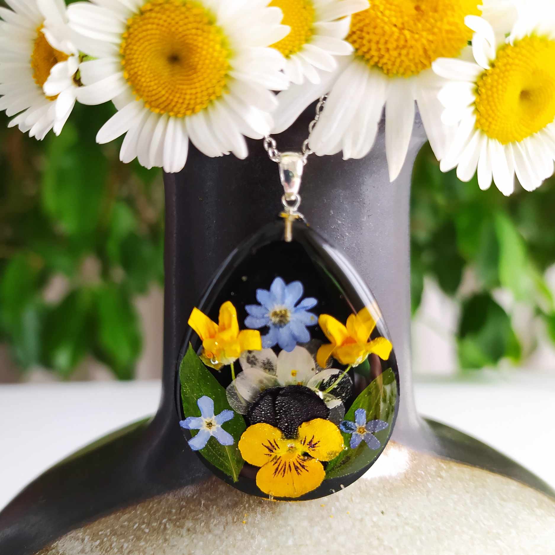 Maceška, pomněnky, pryskyřičník, sasanka v černé kapce. Velikost přívěsku 3,9×3 cm, řetízek chirurgická ocel, délka 45 cm. Jinou délku řetízku (40,50,60 cm) uveďte v poznámce na konci objednávky.