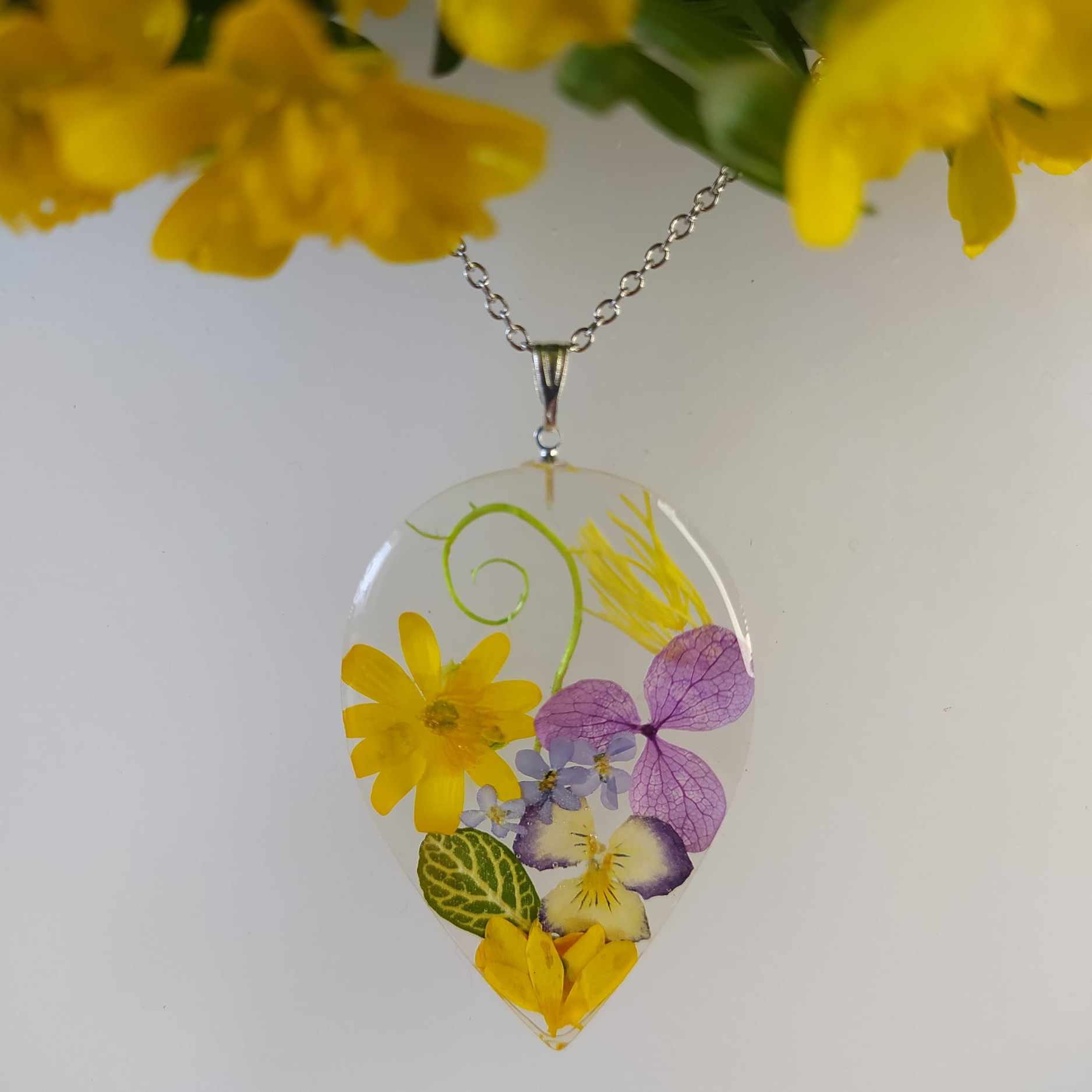 Barevné kvítí v obrácené kapce. Velikost přívěsku 4,8×3,2 cm. Řetízek chirurgická ocel, délka 45 cm. Jinou délku řetízku (40,50,60 cm) uveďte v poznámce na konci objednávky.
