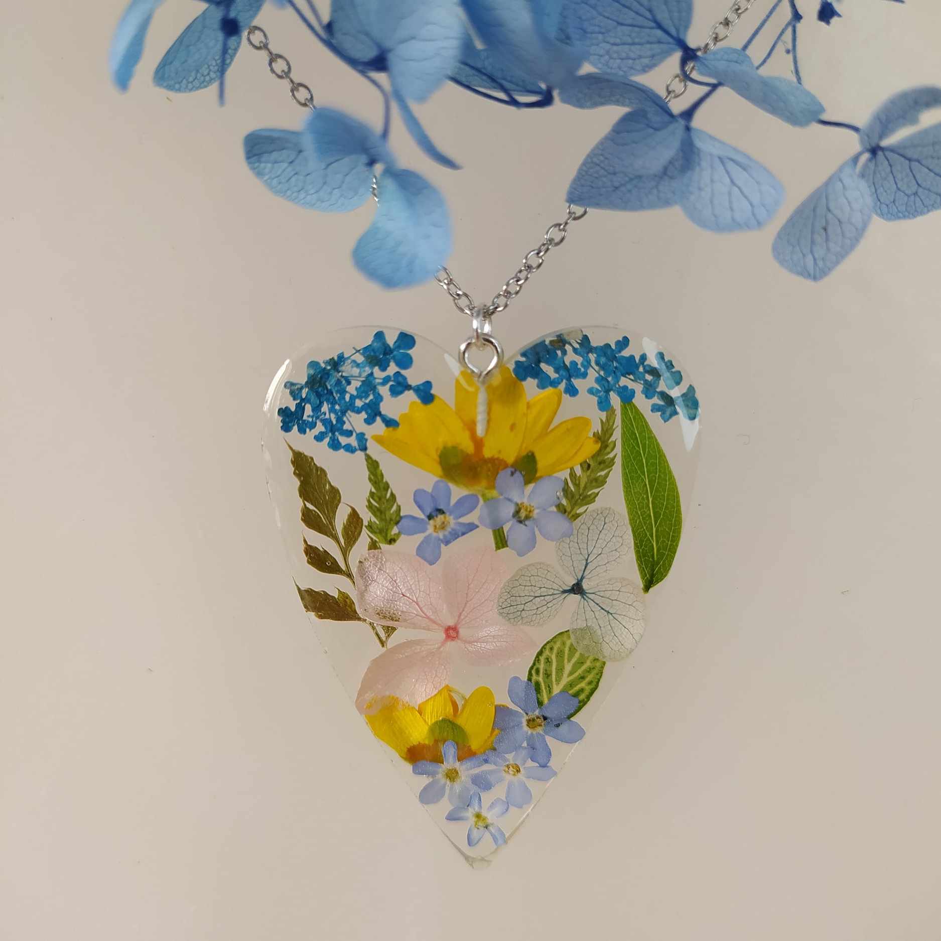 Barevné kvítí v srdíčku. Velikost přívěsku 5×3,6 cm. Řetízek chirurgická ocel, délka 45 cm. Jinou délku řetízku (40,50,60 cm) uveďte v poznámce na konci objednávky.