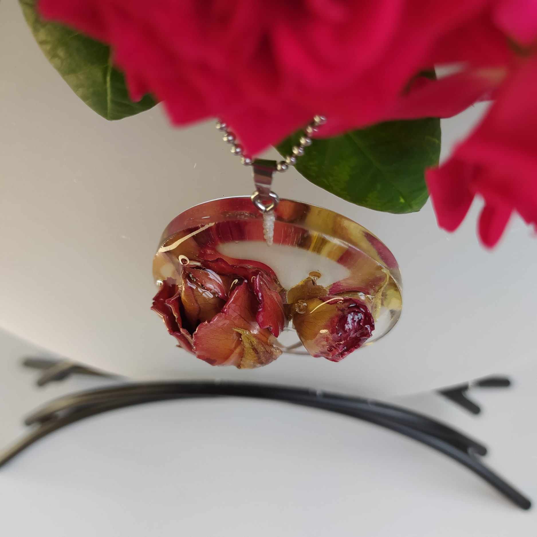 Čajové růže s 3D efektem. Průměr přívěsku 4,1 cm, řetízek chirurgická ocel, délka 45 cm. Jinou délku řetízku (40,50,60 cm) uveďte v poznámce na konci objednávky.