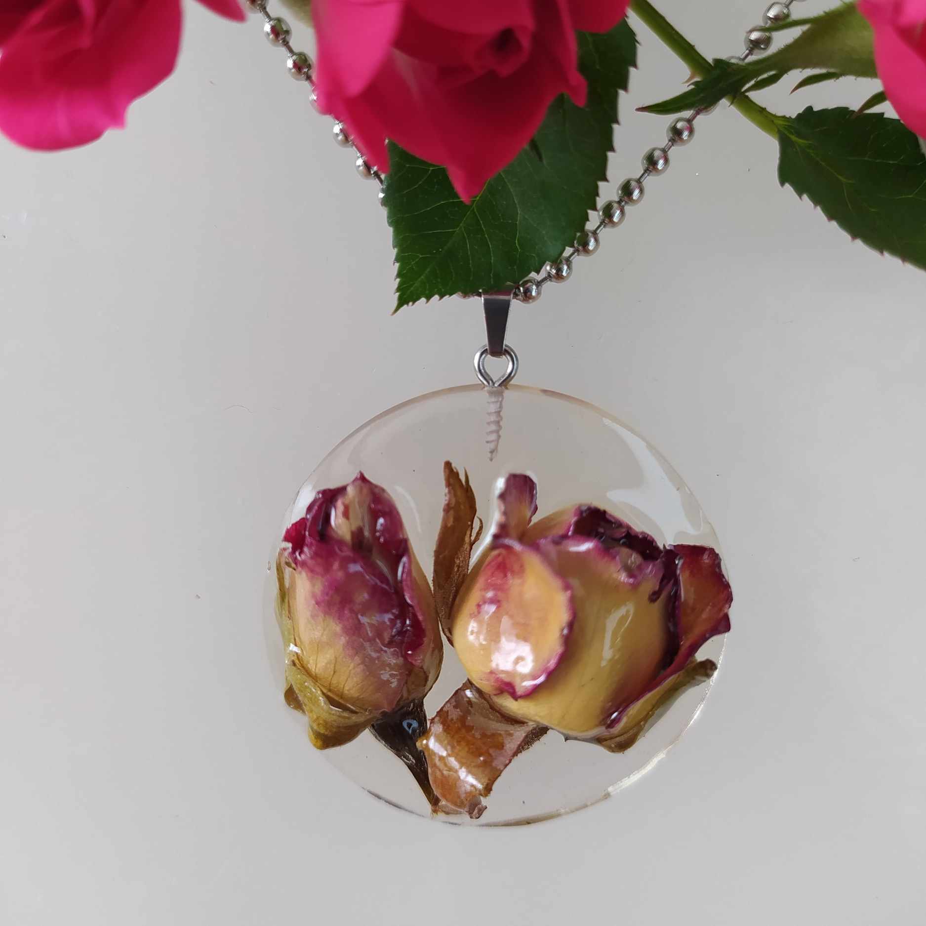Žluto-růžové čajové růže s D efektem. Průměr přívěsku 4,1 cm, řetízek chirurgická ocel, délka 45 cm. Jinou délku řetízku (40,50,60 cm) uveďte v poznámce na konci objednávky.
