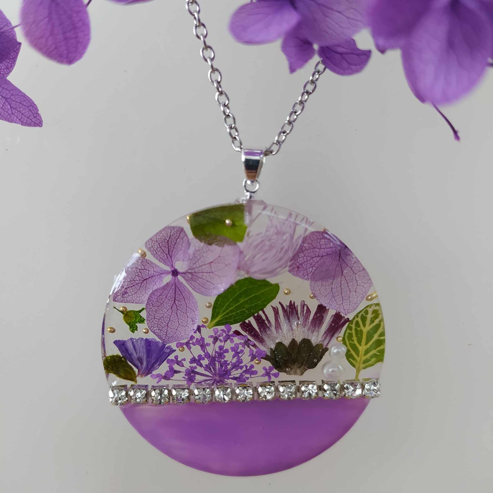 Fialová hortenzie, sedmikráska a další květy s perličkami a fialovou částí, oddělenou štrasovými kamínky. Průměr přívěsku 4,5 cm, řetízek chirurgická ocel, délka 45 cm. Jinou délku řetízku (40,50,60 cm) uveďte v poznámce na konci objednávky.