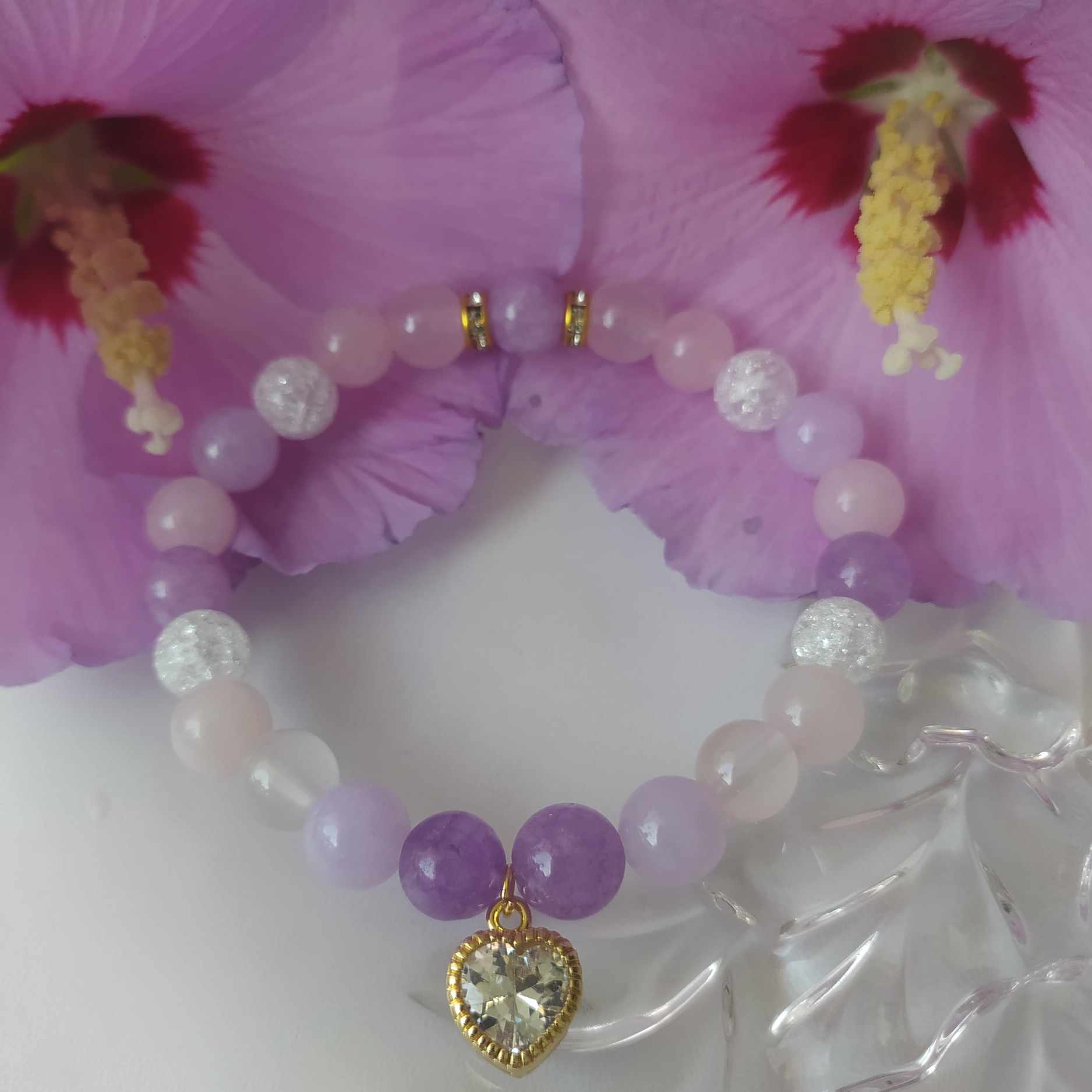 Náramek z ametystu, růženínu, angelitu a křišťálu se zlatým srdíčkem Swarovski. Velikost korálků 8 mm, velikost náramku 17 cm. Potřebujete-li jinou velikost, uveďte ji do poznámky na konci objednávky.