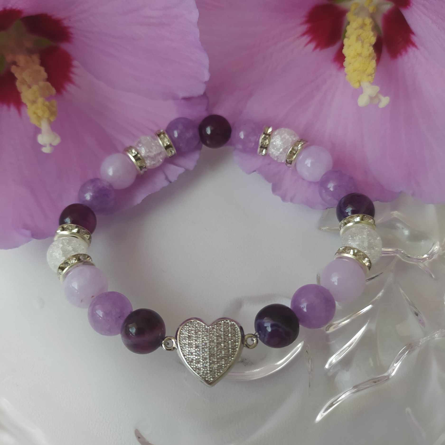Náramek z ametystu, angelitu a křišťálu se zirkonovým srdíčkem. Velikost korálků 8 mm, velikost náramku 16 cm. Potřebujete-li jinou velikost, uveďte ji do poznámky na konci objednávky.