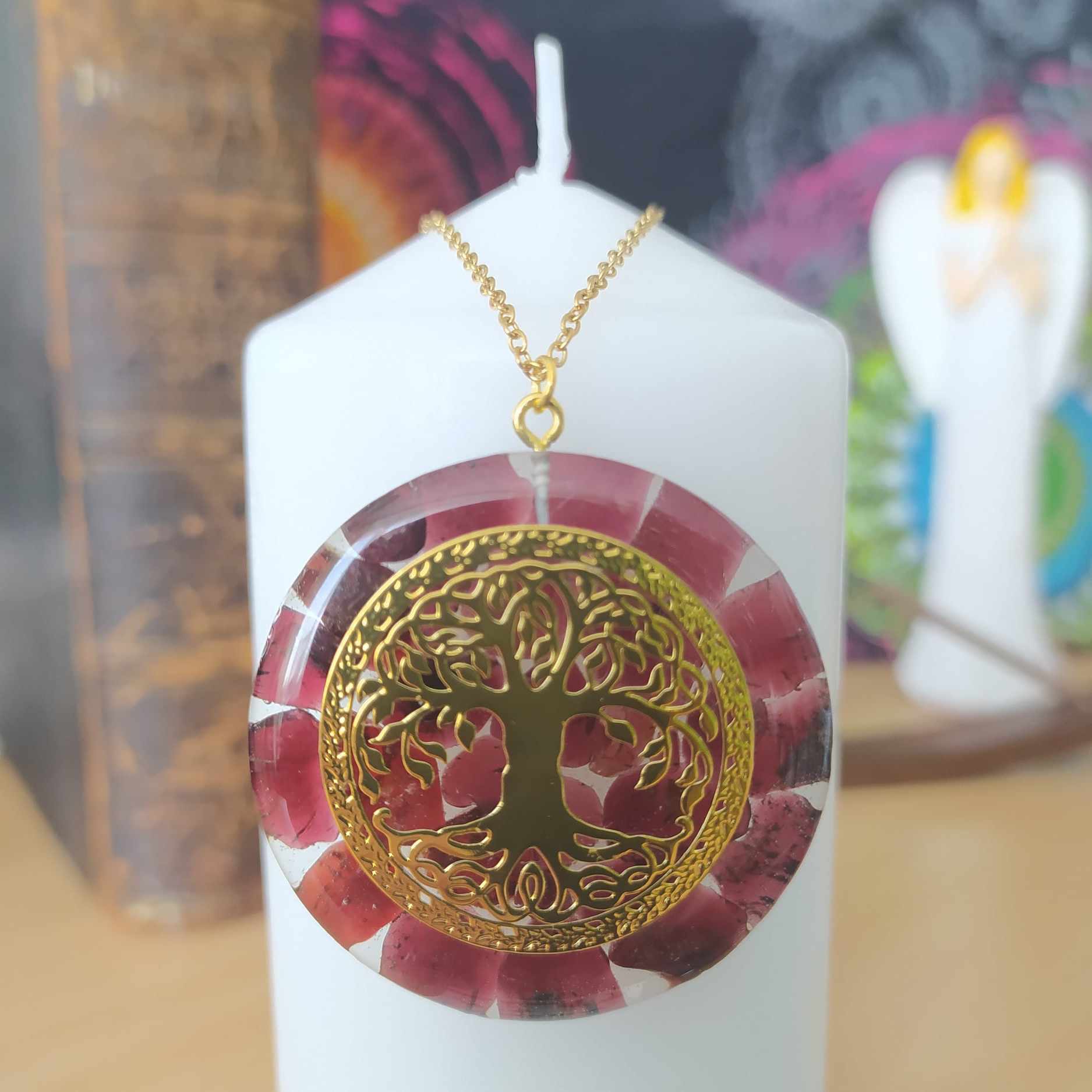 Průměr 4 cm, minerál Granát se stromem života. Řetízek chirurgická ocel zlacená 24 karátovým zlatem. Délka řetízku 45 cm. Jinou délku řetízku (40,50,60 cm) uveďte do poznámky.