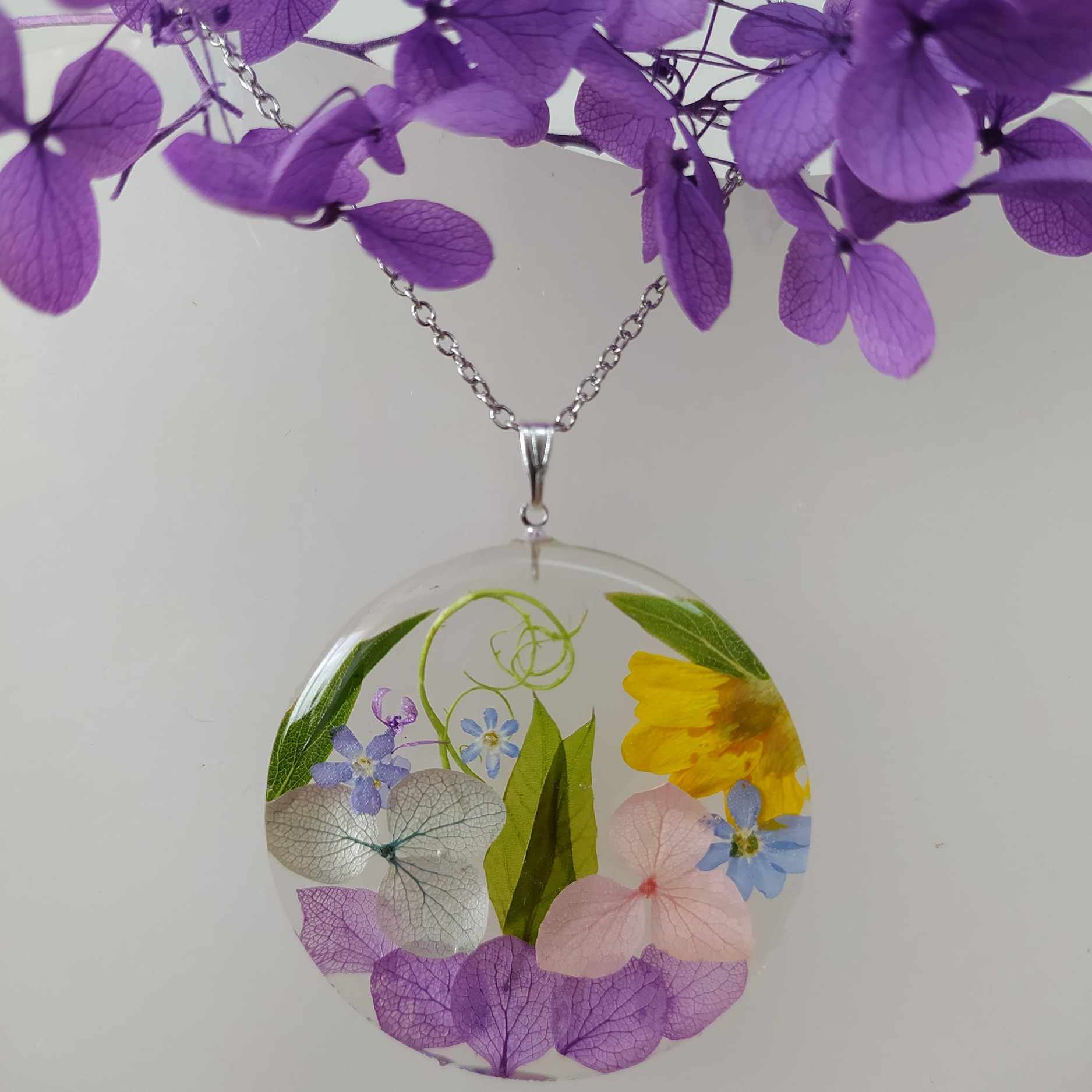 Hortenzie a luční kvítí. Průměr přívěsku 4,1 cm. Řetízek chirurgická ocel, délka 45 cm. Jinou délku řetízku (40,50,60 cm) uveďte v poznámce na konci objednávky.