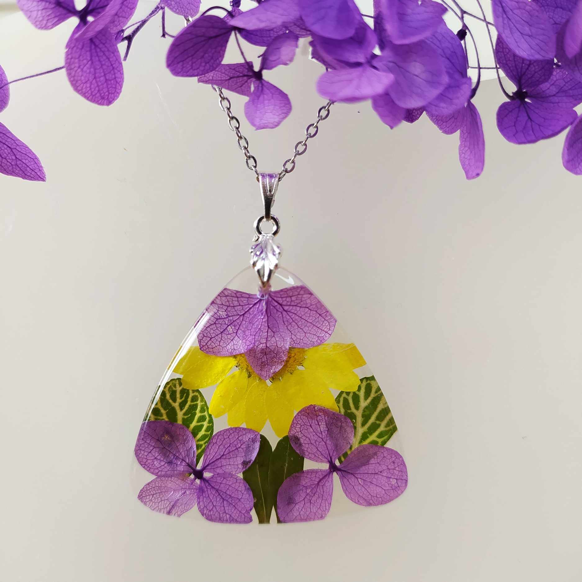 Hortenzie s chryzantémou. Velikost přívěsku 3,8×4 cm. Řetízek chirurgická ocel, délka 45 cm. Jinou délku řetízku (40,50,60 cm) uveďte v poznámce na konci objednávky.