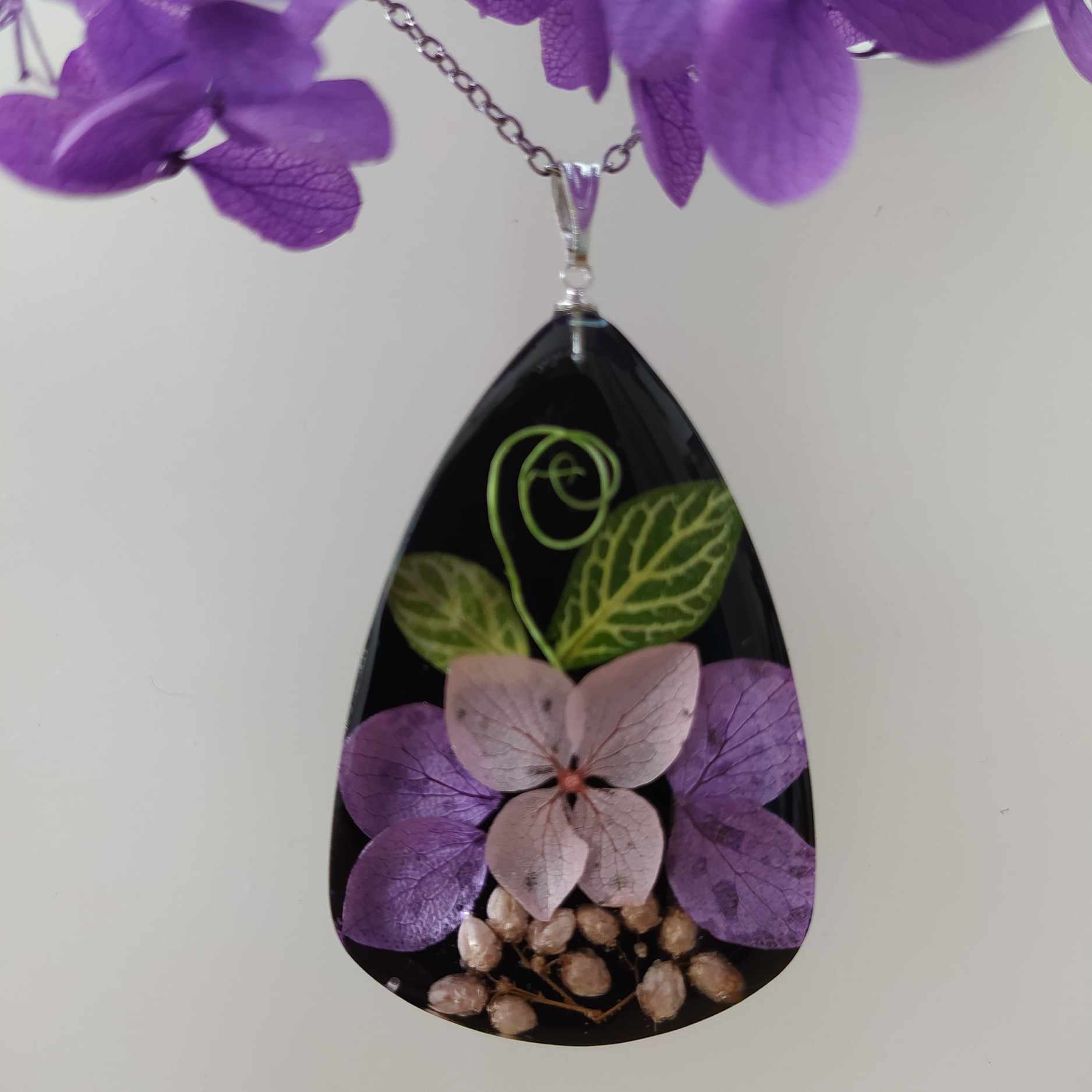 Hortenzie na černém podkladu. Velikost přívěsku 4,8×3,2 cm. Řetízek chirurgická ocel, délka 45 cm. Jinou délku řetízku (40,50,60 cm) uveďte v poznámce na konci objednávky.