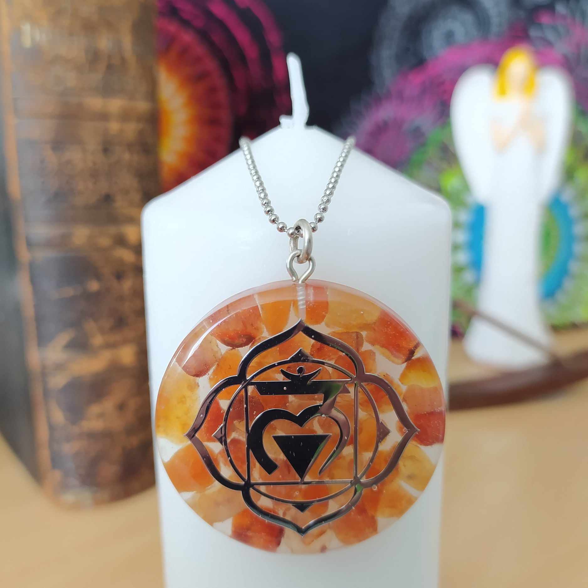 Průměr 4,1 cm, minerál Karneol s čakrovým symbolem. Řetízek chirurgická ocel. Délka řetízku 45 cm. Jinou délku (40,50,60 cm) uveďte do poznámky.