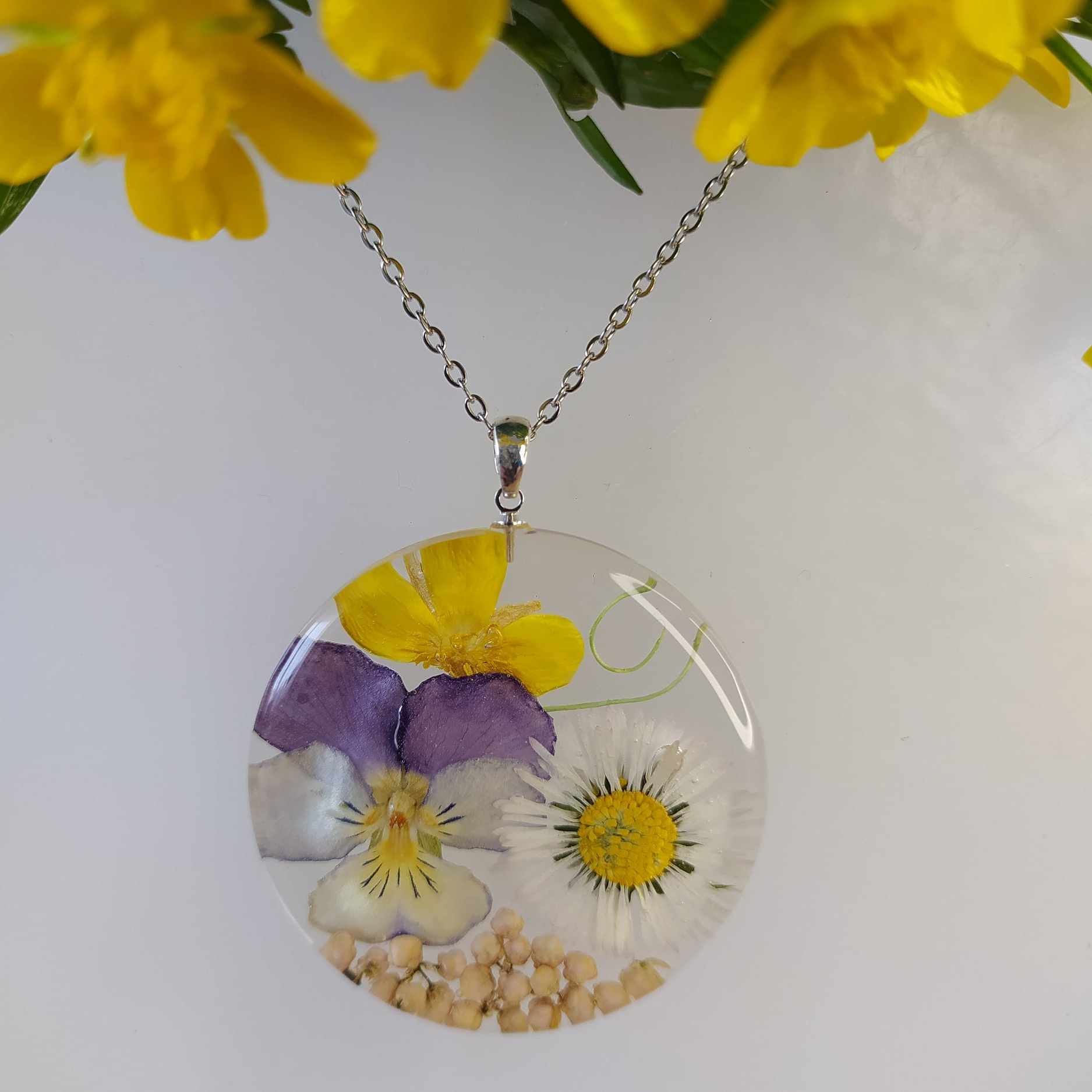 Maceška a sedmikráska. Průměr přívěsku 4,2 cm. Řetízek chirurgická ocel, délka 45 cm. Jinou délku řetízku (40,50,60 cm) uveďte v poznámce na konci objednávky.