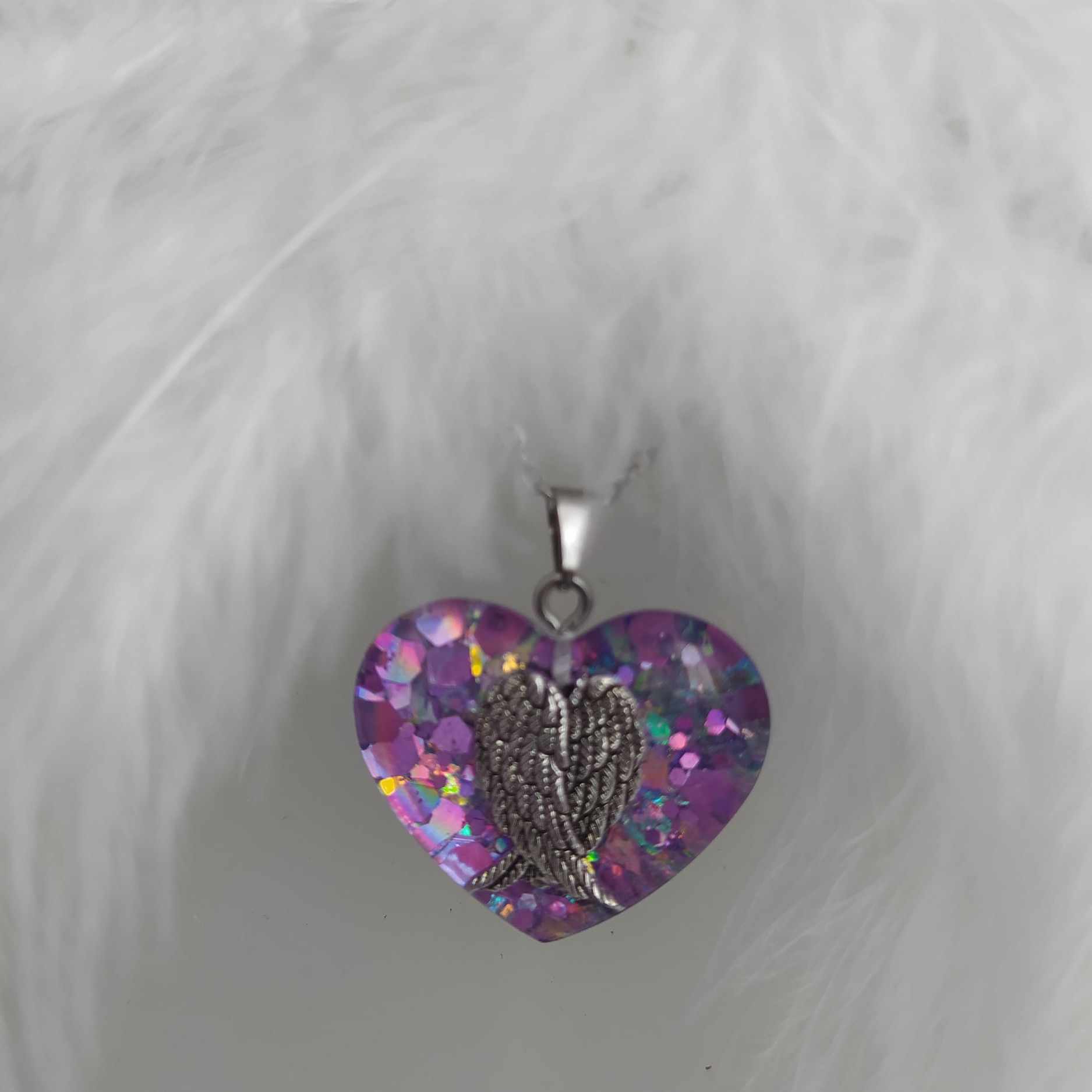 Starostříbrná andělská křidélka na fialovém lesklém podkladu. Velikost 2,8 x 2,3 cm. Řetízek chirurgická ocel, délka 45 cm. Přejete-li si jinou délku řetízku (40,50,60 cm) uveďte ji do poznámky na konci objednávky.