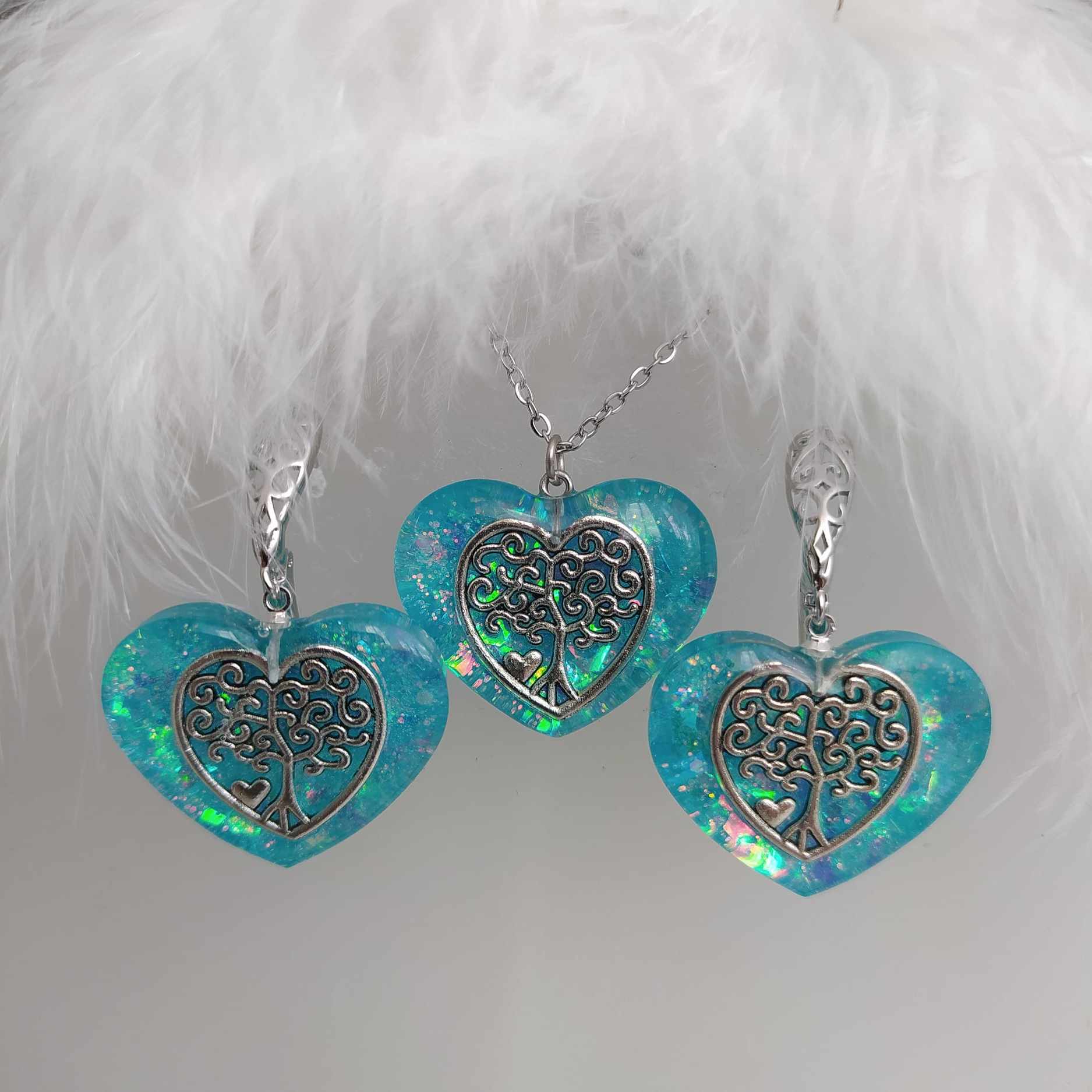 Starostříbrný strom života na modrém lesklém podkladu. Přívěsek velikost 2,8 x 2,3 cm, náušnice 2,8×2,3 cm (4 cm). Náušnicové spony chirurgická ocel, řetízek chirurgická ocel, délka 45 cm. Přejete-li si jinou délku řetízku (40,50,60 cm) uveďte ji do poznámky na konci objednávky.