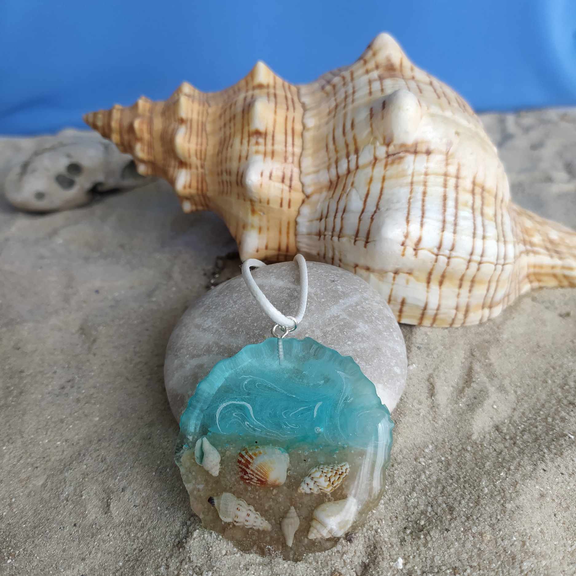 Mušle v písku na břehu moře, zubatý okraj. Průměr kruhu 4 cm. Bílá voskovaná šňůra s prodlužujícím řetízkem, velikost 45-50 cm.