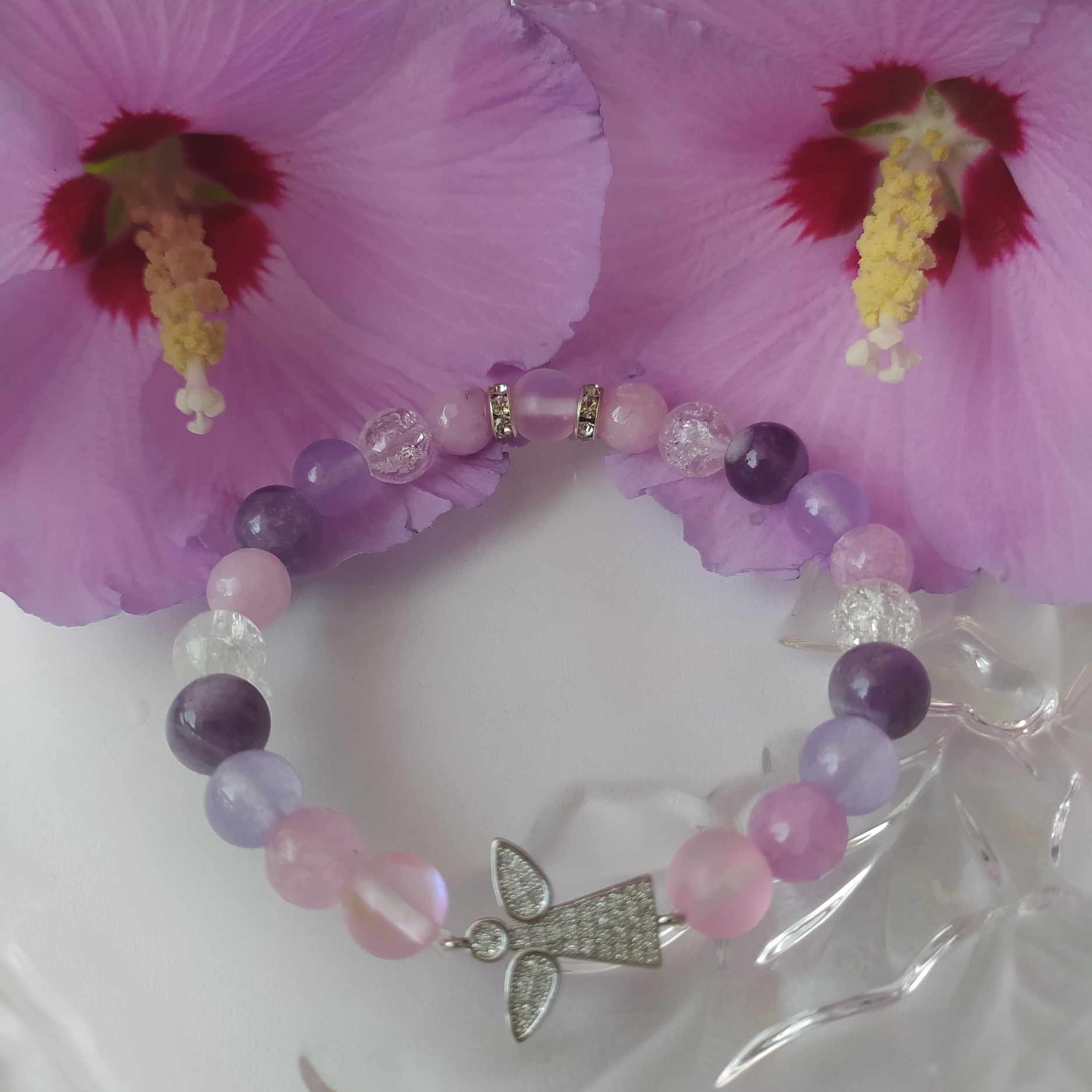 Pastelově fialovo-růžovo-bílý náramek se zirkonovým andělem
