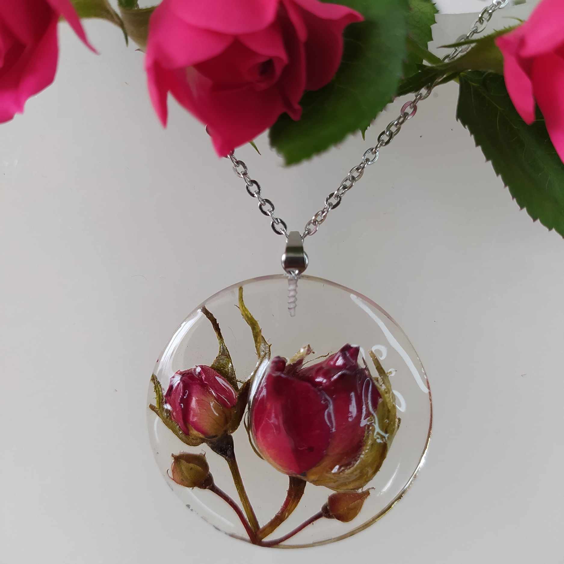 Poupata tmavě růžové čajové růže s 3D efektem. Průměr přívěsku 4,1 cm, řetízek chirurgická ocel, délka 45 cm. Jinou délku řetízku (40,50,60 cm) uveďte v poznámce na konci objednávky.