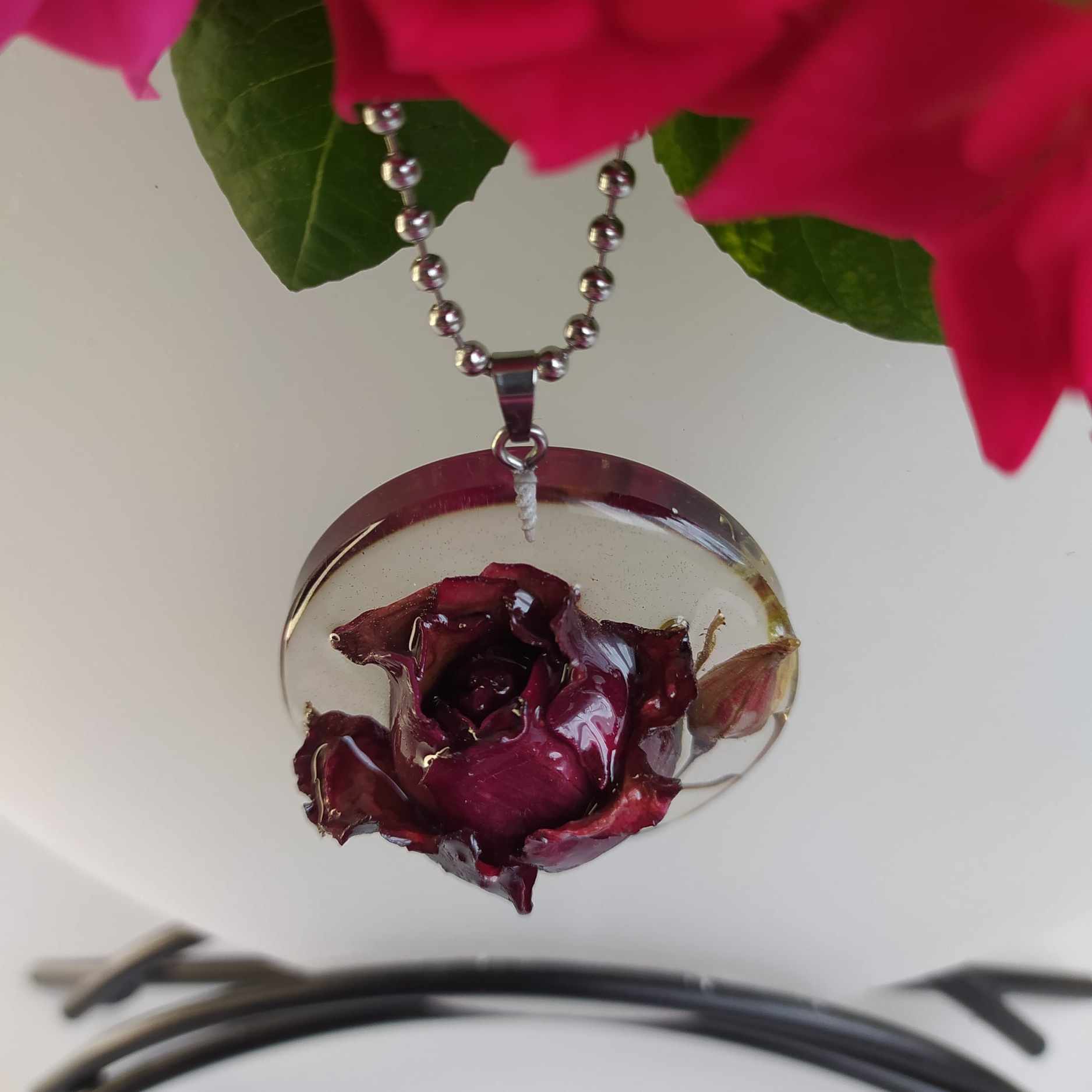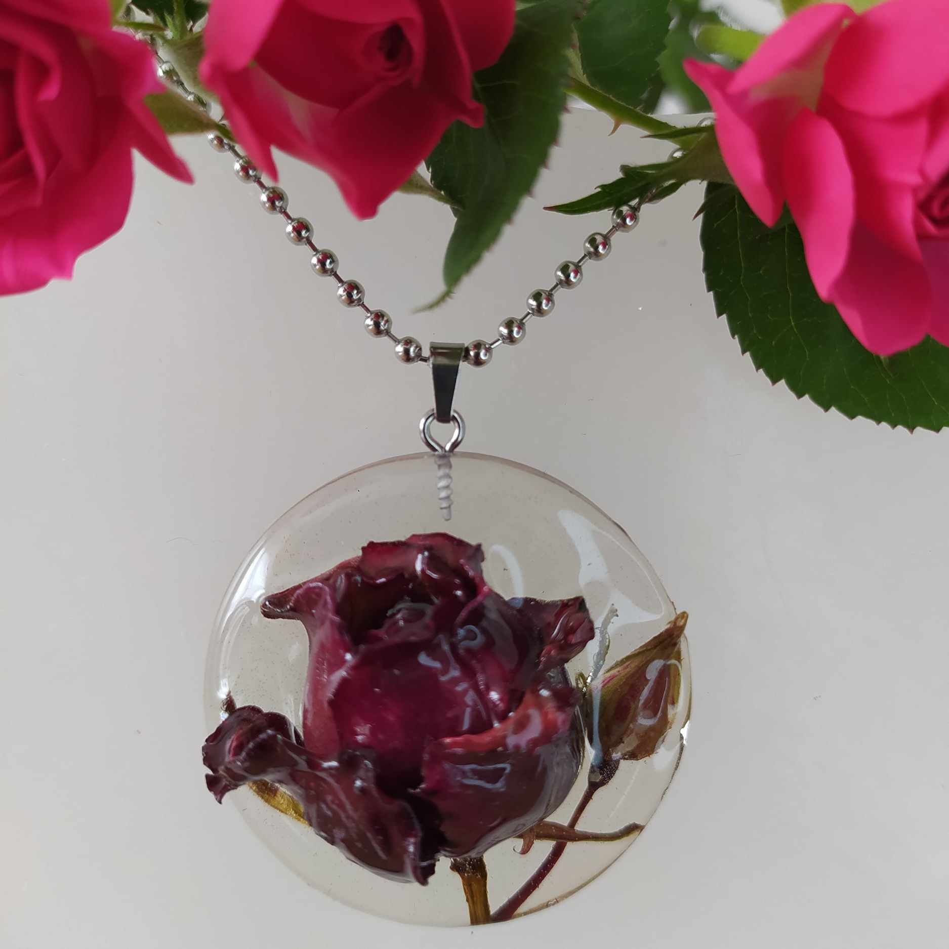 Rudá růže s 3D efektem. Průměr přívěsku 4,2 cm, řetízek chirurgická ocel, délka 45 cm. Jinou délku řetízku (40,50,60 cm) uveďte v poznámce na konci objednávky.