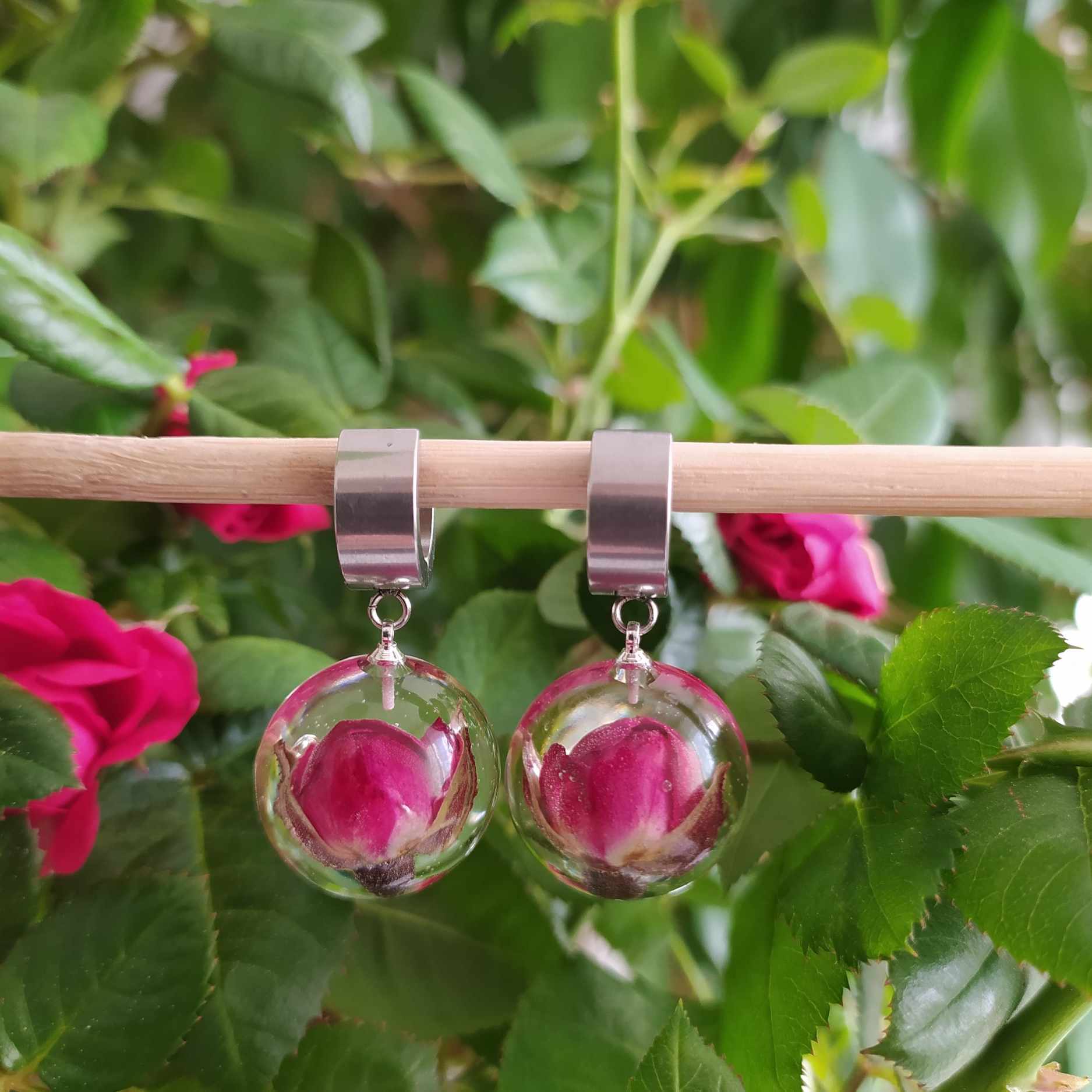 Poupata růží v pecičce. Průměr pecky 2 cm, celková délka 4 cm. Zapínání na závěs. Chirurgická ocel.