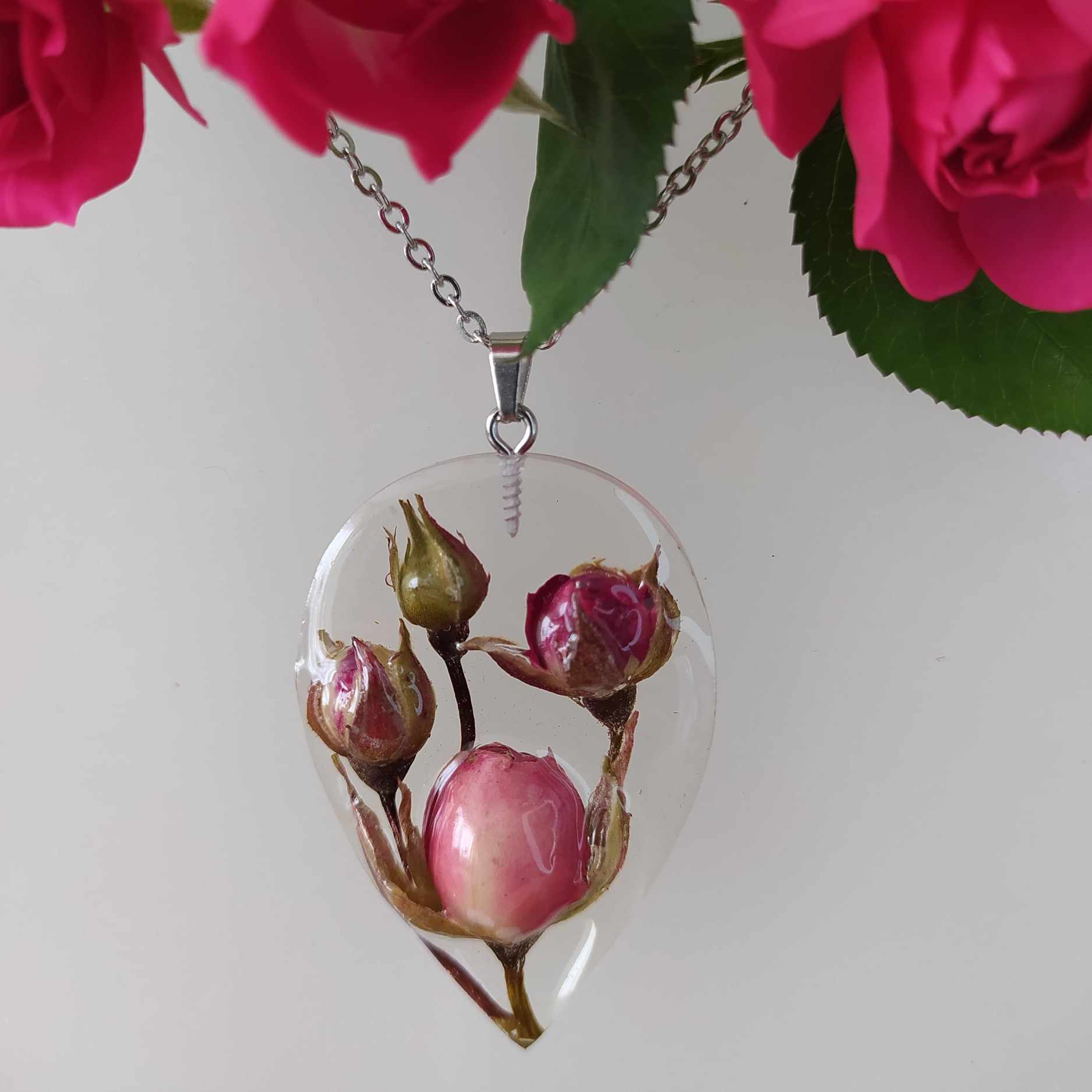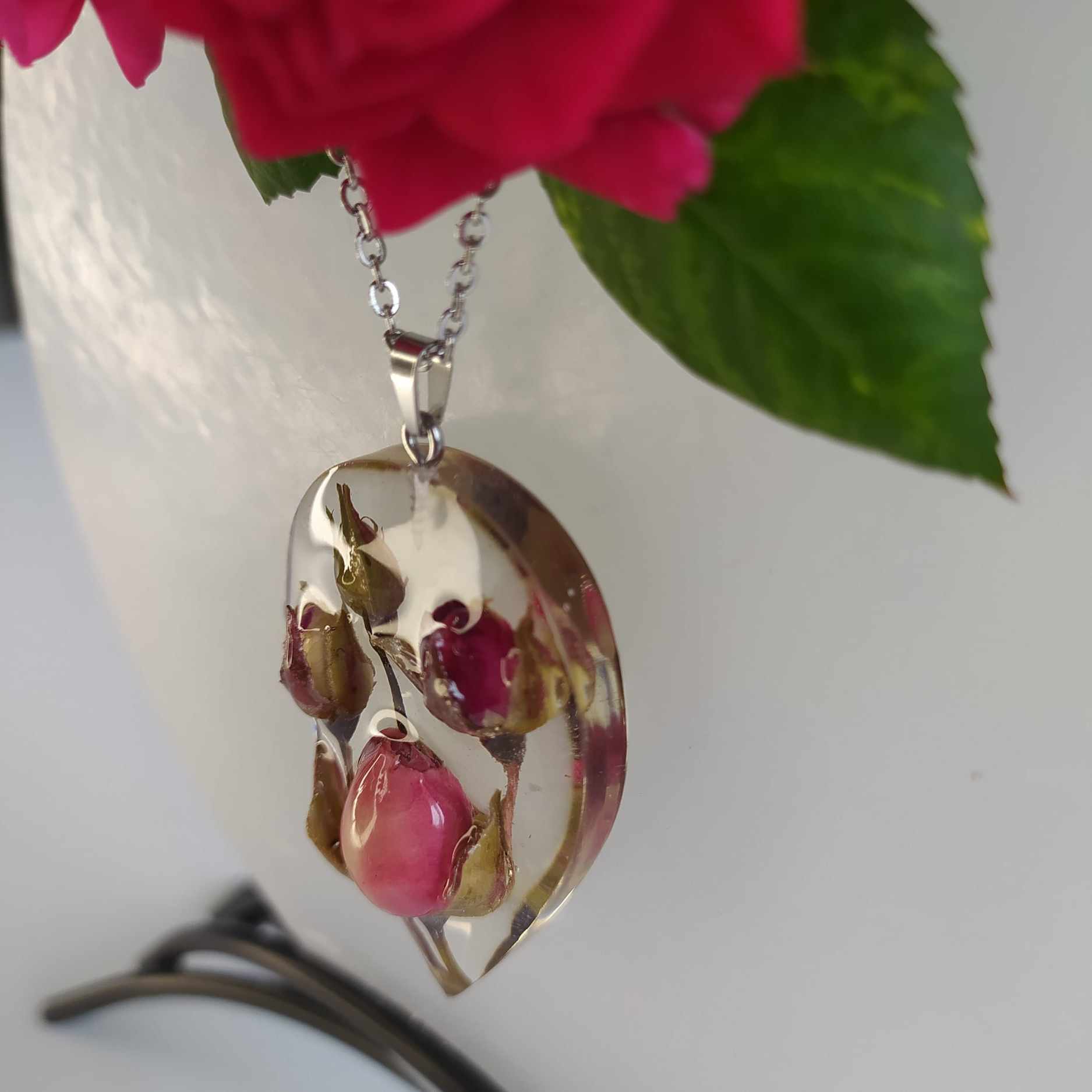Růžová poupata s 3D efektem. Velikost přívěsku 4,8×3 cm. Řetízek chirurgická ocel, délka 45 cm. Jinou délku řetízku (40,50,60 cm) uveďte v poznámce na konci objednávky.