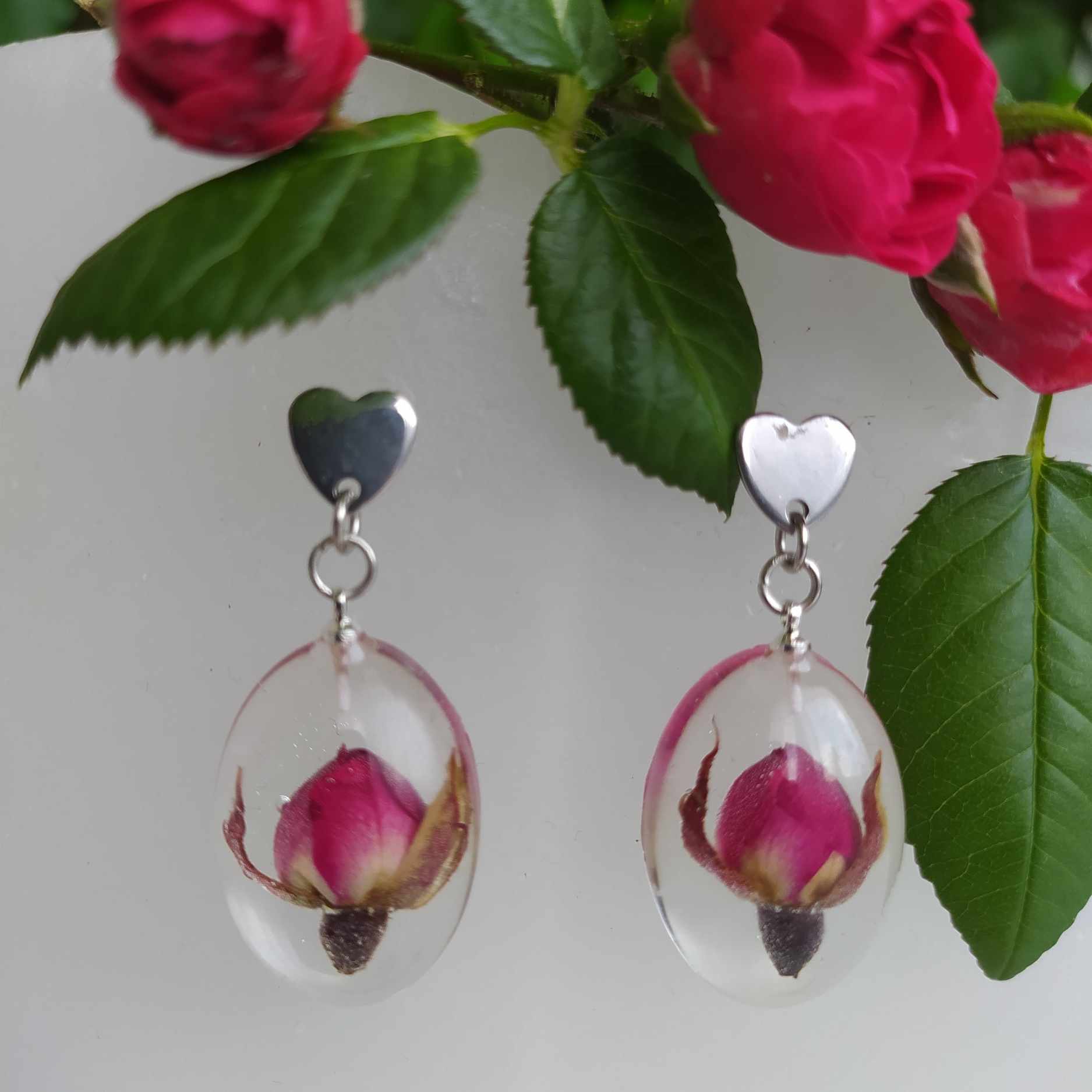 Poupata růží na závěsu. Šířka 1,8 cm, délka oválu 2,6 cm, celková délka 4 cm. Puzetové zapínání. Chirurgická ocel.