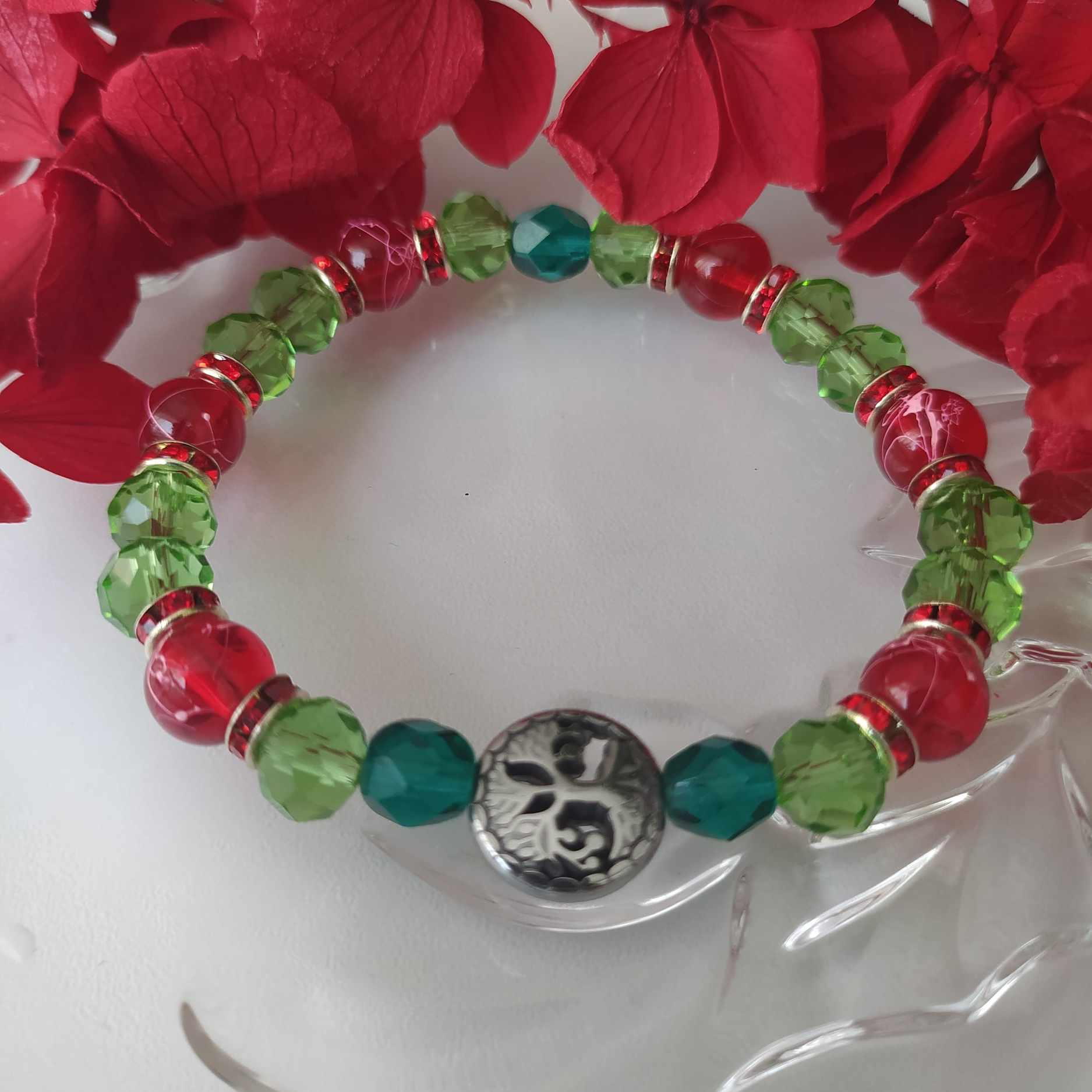 Náramek ze zelených a červených korálků s nerezovým stromem života. Velikost korálků 6 a 8 mm, velikost náramku 15,5 cm. Potřebujete-li jinou velikost, uveďte ji do poznámky na konci objednávky.