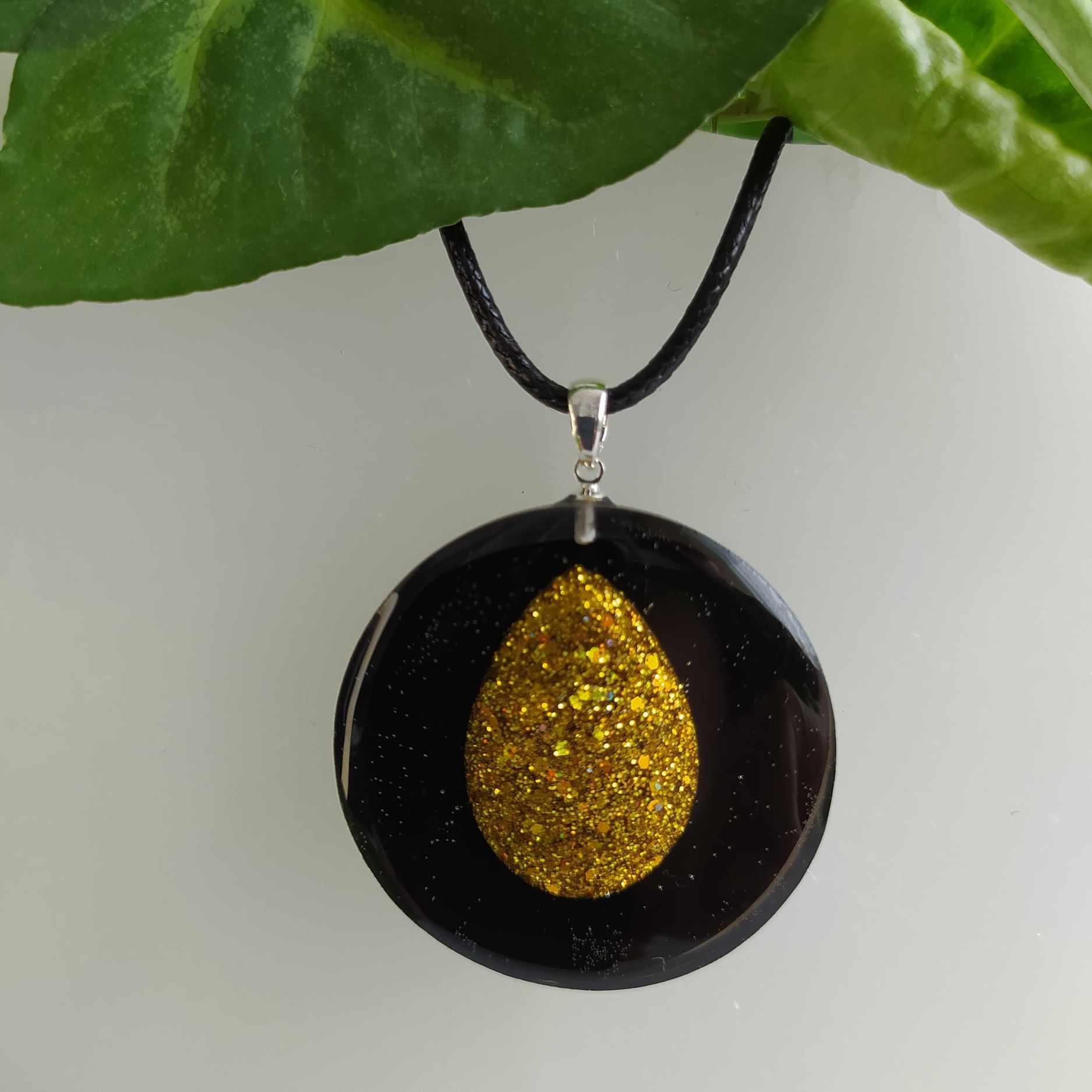 Zlatá plastická kapka v černém kruhu. Průměr kruhu 3,5 cm. Černá voskovaná šňůra s prodlužovacím řetízkem 40-45 cm.